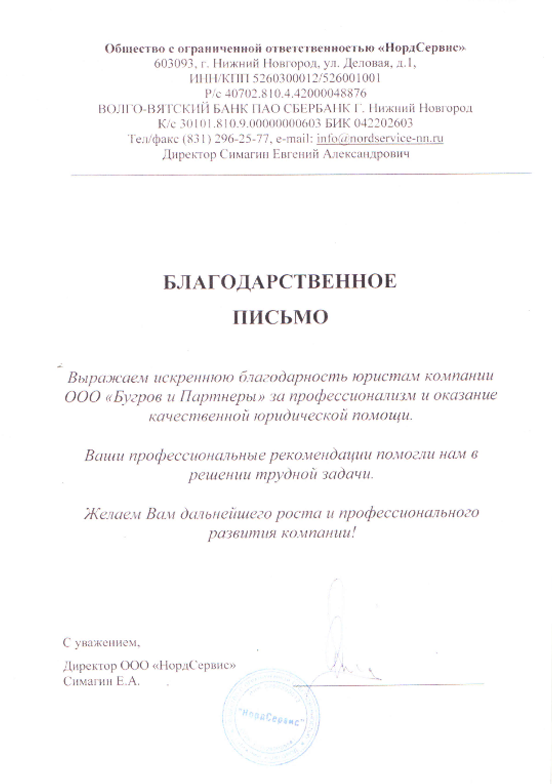 Благодарность юристам компании за профессионализм и оказание качественной юридической помощь